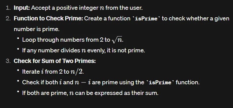 function checks if a given number is prime. It returns 1 for prime numbers and 0 for non-prime numbers. - canExpressAsSumOfTwoPrimes Function: This function checks if the input number can be expressed as the sum of two prime numbers. It iterates through pairs of numbers () and checks if both are prime using the