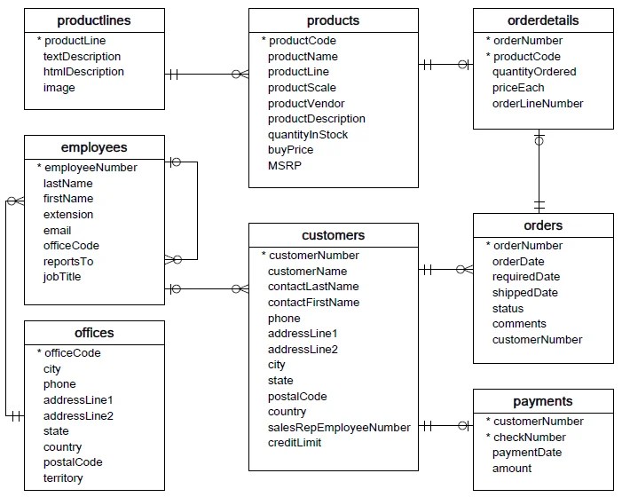 We use the classicmodels database as a MySQL sample database to help you work with MySQL quickly and effectively. The classicmodels database is a retailer of scale models of classic cars database. It contains typical business data such as customers, products, sales orders, sales order line items, etc.